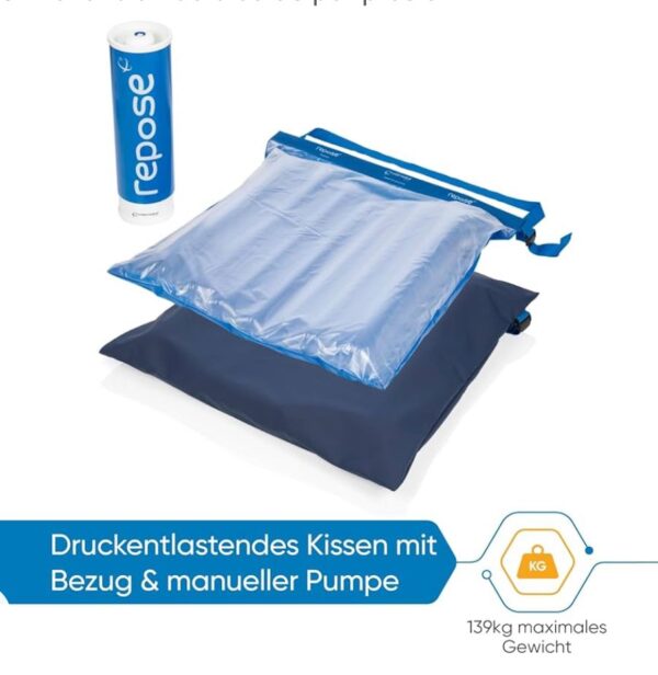 1.- Se compone de 6 cámaras de poliuretano y de aire interconectadas que se comunican entre sí. Las 2 cámaras exteriores son más anchas, ofreciendo una mejor estabilidad proporcionando una completa descarga de presión del Sacro.